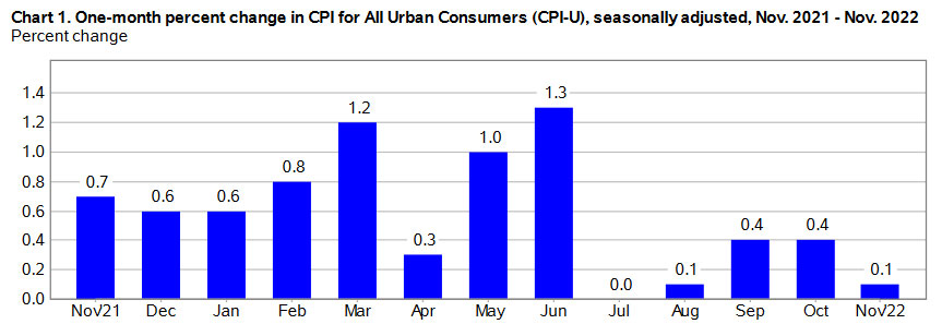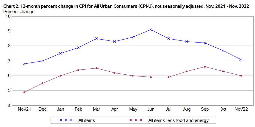 But since June, inflation has been slipping lower along with falling gas prices, dropping to an annual rate of 7.1% in November. Here is the year-over-year trend in U.S. inflation in the last 12 months, showing the gradual decline in all-items inflation, even as core inflation has remained stubbornly around 6%: