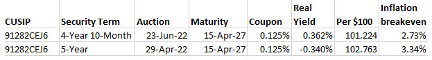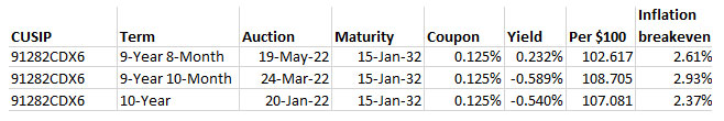 The first TIPS auction of the year got a real yield of -0.540%, and its first reopening in March was even worse at -0.589%. This may be the last 10-year TIPS with a coupon rate of 0.125% for awhile. (I hope.)