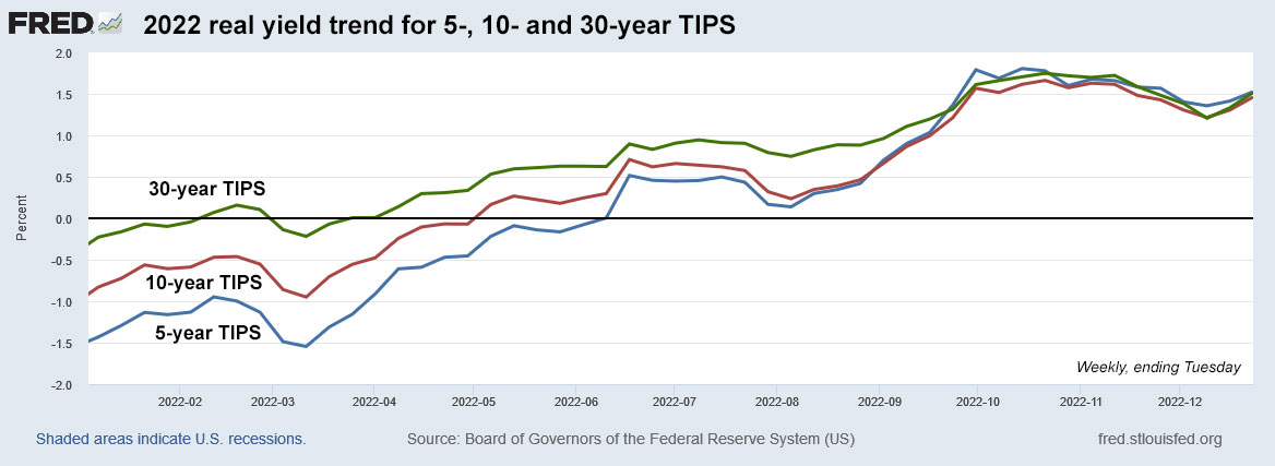 TIPS began the year as an “undesirable investment,” but by mid-year they started getting more and more desirable. The reason can be summed up in this one chart, the trend of TIPS real yields throughout 2022: