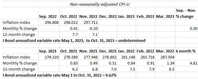 We will know what the CPI change is and the corresponding variable rate in mid-Oct for the Nov 1 reset. And the fixed rate (to compensate for a theoretical negative variable rate in the example) would continue for the life of the ibond…therefore another option if one is so inclined is to “bank” the fixed amount in bond purchases between May 1 and Nov 1 reset…right?