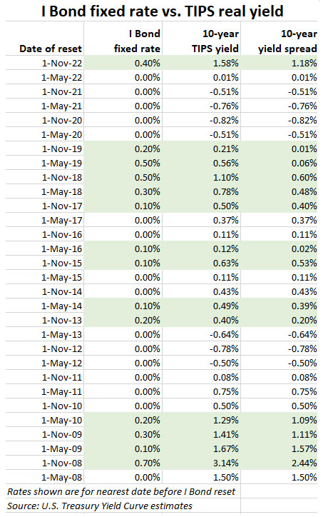Oddly enough, 1.58% is exactly where the 10-year TIPS was trading on Oct. 31, 2022, the day before the Treasury raised the I Bond’s fixed rate from 0.0% to 0.4%. My opinion: The fixed rate should have been higher, but I was pleased with the decision to raise it at a time when TreasuryDirect was overwhelmed by demand for I Bonds.