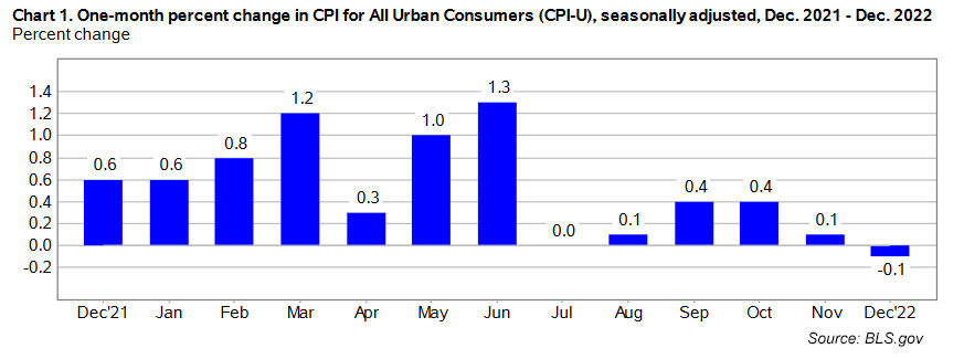 U.S. inflation transitioned to deflation in December, with the all-items Consumer Price Index for All Urban Consumers falling 0.1% for the month, after increasing just 0.1% in November, the Bureau of Labor Statistics reported today. Inflation for the year 2022 ended at 6.5%, falling below 2021’s 7.0%.