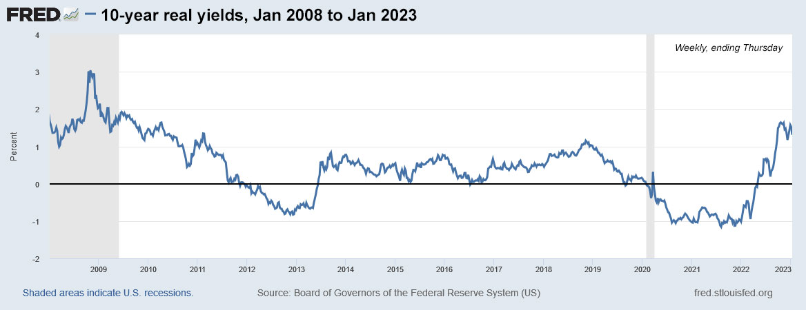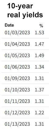 Back on Jan. 14, 2022, a 10-year Treasury Inflation-Protected Security had a real yield of -0.66%. In other words, an investor was accepting a return that would trail official U.S. inflation by 0.66% for 10 years. By April 1, that yield had “increased” to -0.41%. By June 1, it was 0.29%. And now, in mid-January 2023, the 10-year TIPS has a real yield of 1.31%, 197 basis points higher than a year ago.