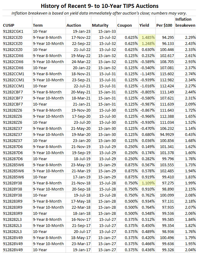 There will be six 10-year TIPS opening and reopening auctions in 2023 — this one in January, and then every other month through November. So investors will have many opportunities. But the key concern is how long real yields can remain at historically high levels. They could certainly go higher, but they certainly could move lower if recession looms.