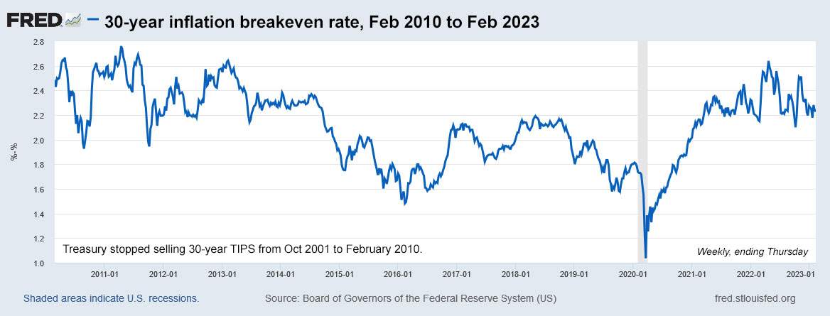 Here is the trend in the 30-year inflation breakeven rate from 2010 to 2023: