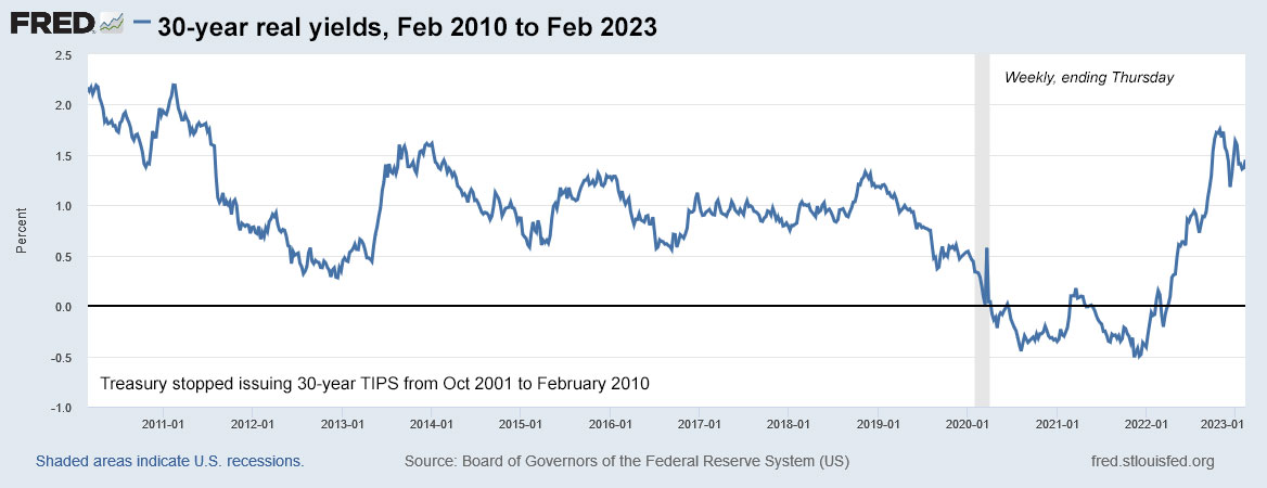 This chart shows the history of 30-year real yields since the Treasury reinstated the 30-year TIPS in February 2010: