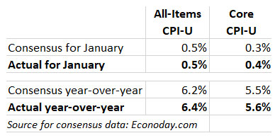 January inflation came in higher than expected, rising 0.5% to an annual rate of 6.4%