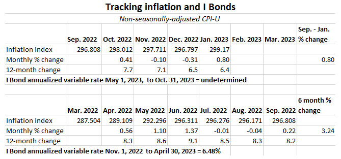 For I Bonds. January’s inflation report is the fourth in a six-month string that will determine the I Bond’s new variable rate, which will be reset on May 1 based on inflation from October 2022 to March 2023. For the first three months of that period, inflation ran at 0.0%, but January’s number boosts the total to 0.8%. That would translate to a variable rate of 1.6%, down from the current 6.48%. But two months remain, and those months are likely to record positive inflation.