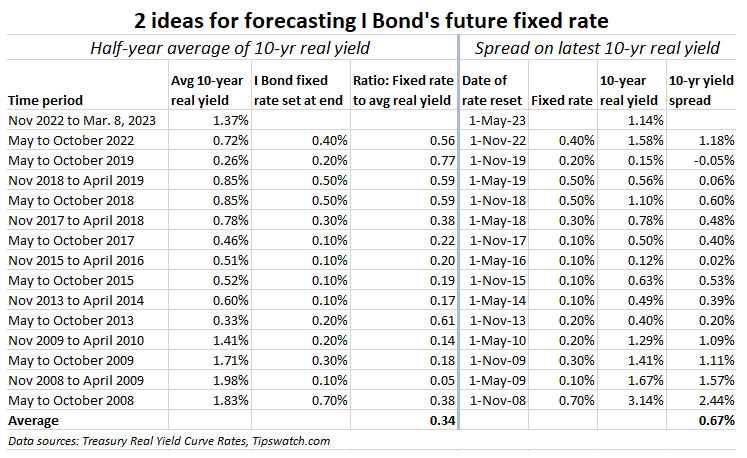 In the most recent rate reset in November 2022, the fixed rate of 0.40% was 56% of the 0.72% six-month average for the 10-year real yield. If you applied that ratio to current 10-year real yield average of 1.37%, you get a fixed rate of 0.80%, rounded to the tenth decimal point. (Fixed rates are always set to the tenth decimal point, such as 0.40% currently.)