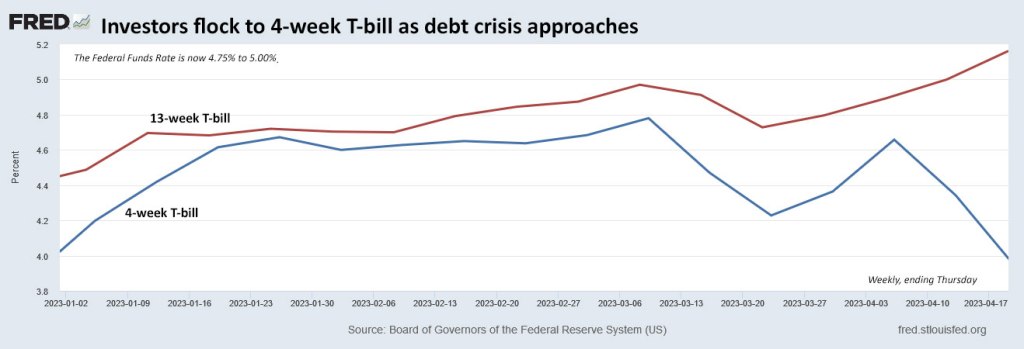 Debt default gets the headlines, for obvious reasons, but to get a more complete picture of the turmoil in the 4-week bill market, you have to go back to the middle of March. The last day of normalcy was Friday, March 10 (4.81%); over the weekend, the yield dropped 19 bps to 4.62% on Monday, March 13. By Wednesday, March 15 the yield was 4.23%. The timing suggests that the initial catalyst for the dislocation in the 4-week bill market was not concerns about U.S. debt default, but rather the turmoil in the banking sector. As hundreds of billions of dollars fled the banking sector, it went into money market funds, and those funds are heavy buyers of the highest-rated, shortest-maturity instruments, such as 4-week T-bills. Thus the “message of fear,” at least initially, was fear about the safety of bank deposits, coupled with a belated recognition of the opportunity afforded by the attractive yields available in money market funds. This is not to deny that there will be further anomalies in the short-term bill market as we get better estimates of the X-date in the coming weeks, but it was fear about the banking sector that first disrupted the 4-week bill market, and it has been volatile ever since. The 4-week auctions are now so unpredictable, and produce such low yields, that I avoid them completely.