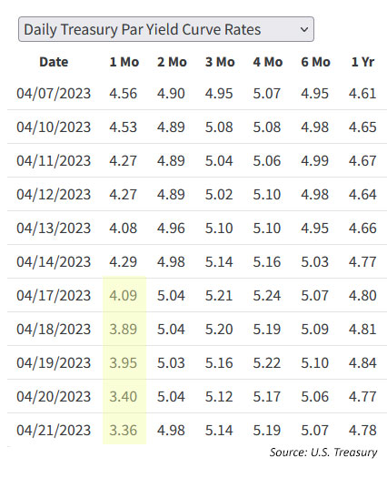 For one thing, the yield on that 4-week T-bill will begin rising dramatically sometime in May, as we approach a potential government shutdown or debt breach.