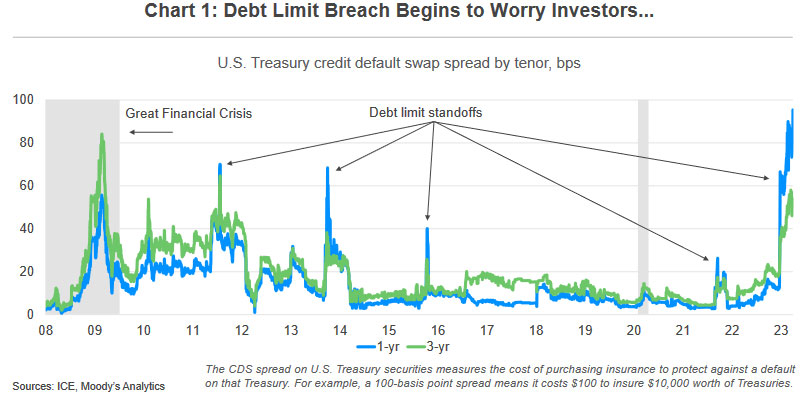 The analysis points out that credit default swaps on U.S. Treasurys — the cost of buying insurance in case the Treasury fails to pay its debt on time — have jumped in recent weeks, to levels even higher than past debt-ceiling disruptions.