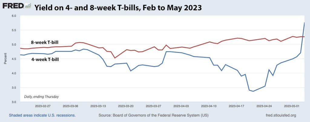 Now, with Yellen announcing a potential x-date of June 1, that situation has reversed, and the 4-week T-bill is now most at risk. The result: Last week’s 4-week Treasury auction got an investment rate of 5.964%, up an incredible 206 basis points from 3.905% the week before.