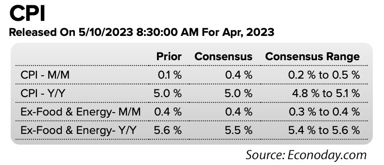 Consensus estimates are pointing toward April inflation coming in at 0.4% for the month and 5.0% for the year, which would hold steady with the March number. Core inflation is expected come in at 0.4% for the month and 5.5% year-over-year. None of this can be viewed as “good news,” and if inflation comes in higher than expected, it could rile financial markets.