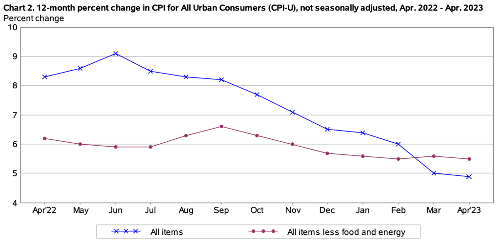 All of these numbers either matched or came close to economist estimates, so no surprises. Although inflation increased 0.4% in April, up from 0.1% in March, the annual all-items number declined from 5.0% to 4.9%, a slight bit of good news. The annual inflation rate has now fallen 11 months in a row. More worrisome is the fact that core inflation is holding steady around 5.5%. Here is a look at all-items and core inflation over the last year: