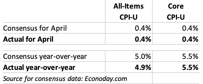 The Consumer Price Index for All Urban Consumers (CPI-U) rose 0.4% in April on a seasonally adjusted basis, the U.S. Bureau of Labor Statistics reported today. Over the last 12 months, the all-items index increased 4.9%.