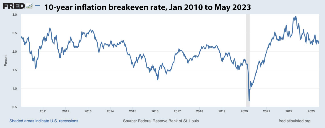Here is the trend in the 10-year inflation breakeven rate over the last 13 years:
