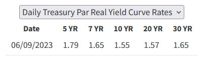 These are U.S. Treasury estimates for full-term TIPS at par value, in other words eliminating any effects from coupon rate premiums or accrued inflation. But as you can see by comparing this to the Vanguard secondary offerings, TIPS in that 2040 to 2043 range remain at attractive yields.