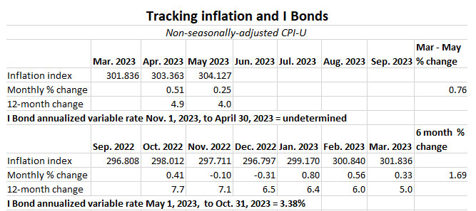 For I Bonds. The May inflation report is the second of a six-month string that will determine the I Bond’s new variable rate, which will be reset November 1. So far, inflation has increased 0.76% in that period, which translates to a variable rate of 1.52%. But four months remain.