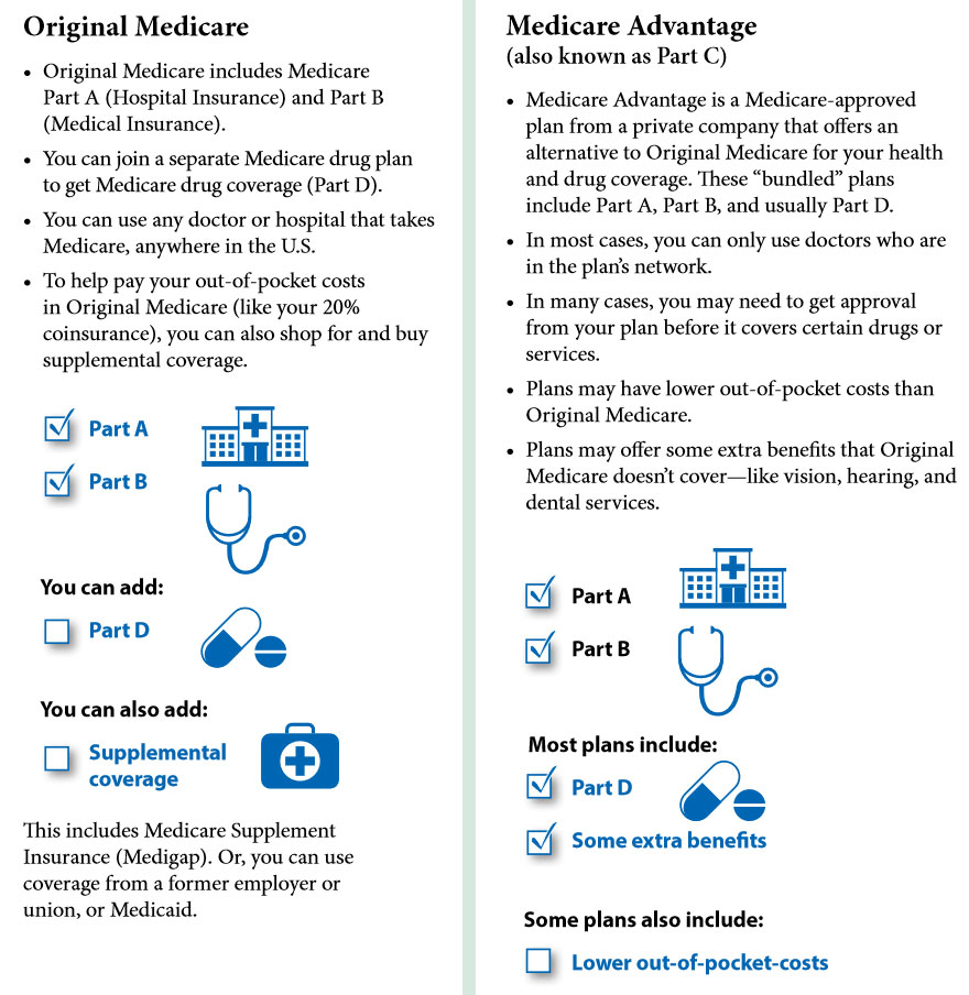 AARP notes in a comparison of original Medicare and Medicare Advantage that the Advantage plans might resemble your past employer-sponsored plan: “Under Medicare Advantage, you will essentially be joining a private insurance plan like you probably had through your employer.”