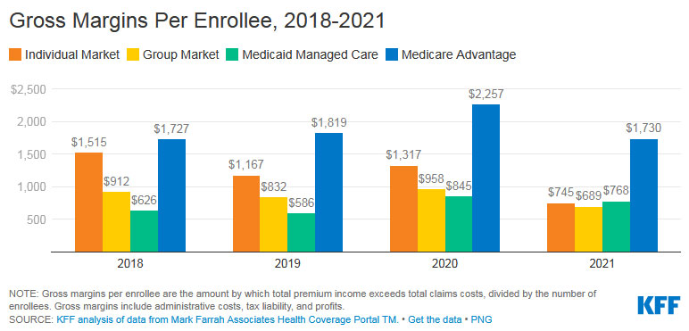 In 2021, KFF found, Medicare Advantage insurers reported gross margins averaging $1,730 per enrollee, at least double the margins reported by insurers in the individual/non-group market ($745), the fully insured group/employer market ($689), and the Medicaid managed care market ($768).