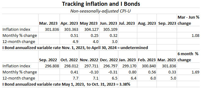 For I Bonds. The June report is the third of a six-month string that will determine the I Bond’s new inflation-adjusted variable rate. So far, inflation from the end of March to June has increased 1.08%, which if nothing else happens would translate to a new annualized variable rate of 2.16%. But three months remain, so it is far too early to make predictions.