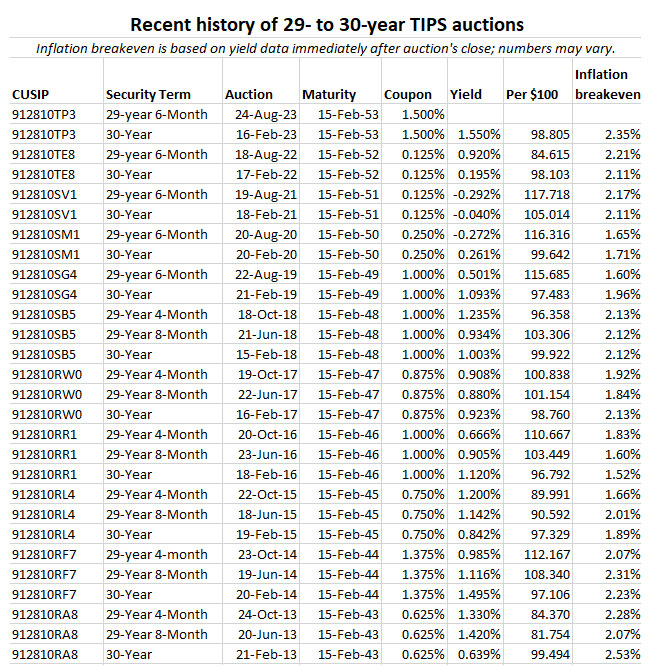 Here is a history of recent TIPS auctions of the 29- to 30-year term: