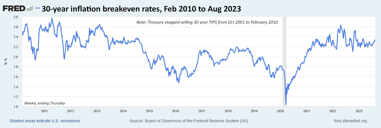 Here’s the trend in the 30-year inflation breakeven rate over the last 13 years, showing the range-bound pattern over recent months: