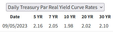During the 2022 to 2023 cycle of Federal Reserve tightening, the 5-year real yield has been the quickest to respond to short-term rate increases and has been lingering around 2.0% since early July 2023. But as you can see in the chart, the 5-year has rarely broken through the 2.0% real-yield barrier at other times back to 2003.