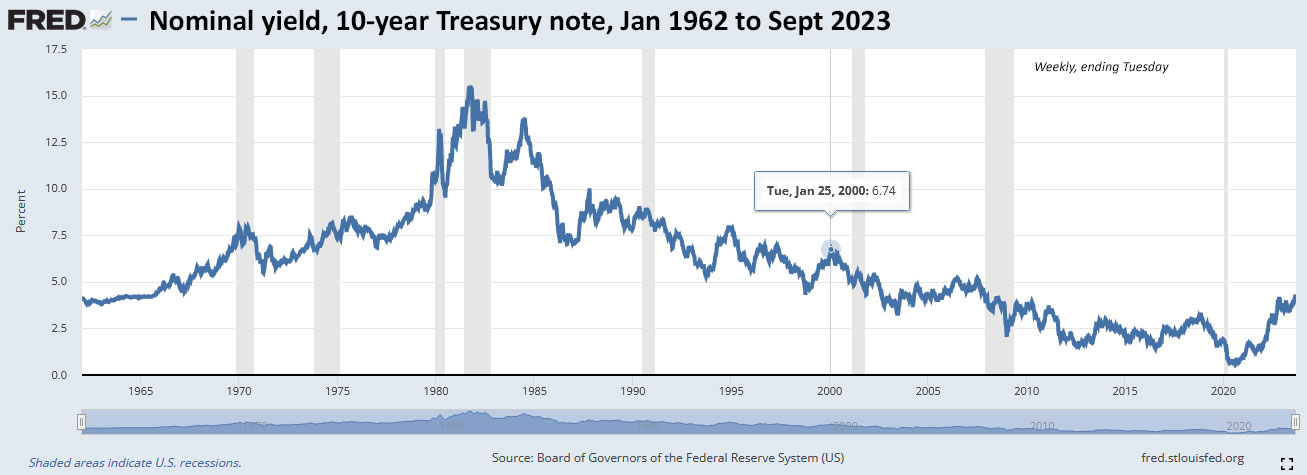 The St. Louis Fed does track nominal 10-year yields all the way back to 1963, so you can get a better idea of the massive fluctuations in yields over the last 60 years, a period that included an intense battle against raging inflation that lasted into the early 1980s. Here is the chart:
