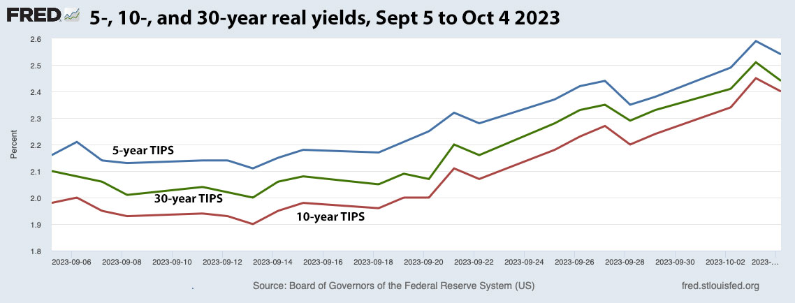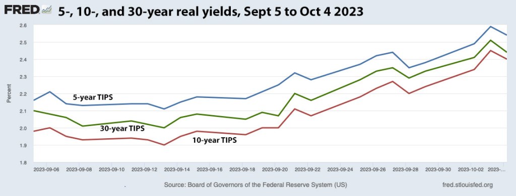 Here is a chart of 5-, 10- and 30-year real yields over the last month. A lot of the surge higher came after Sept 15, the day I left on this trip. (So am I responsible? Sorry!) At the same time, though, the Federal Reserve decided to hold short-term rates steady and Congress avoided a harmful shutdown. So the news wasn’t so bad, by all appearances.