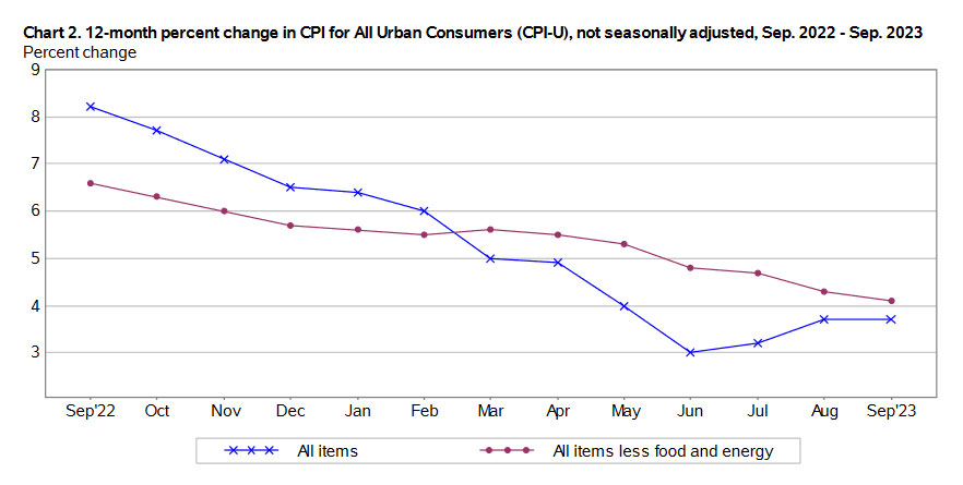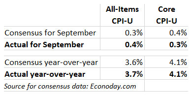 All-items U.S. inflation rose 0.4% in September and 3.7% year over year. Both of those numbers exceeded expectations. Core inflation, which omits food and energy, rose 0.3% for the month (less than the expected 0.4%) and 4.1% year over year (matching expectations).