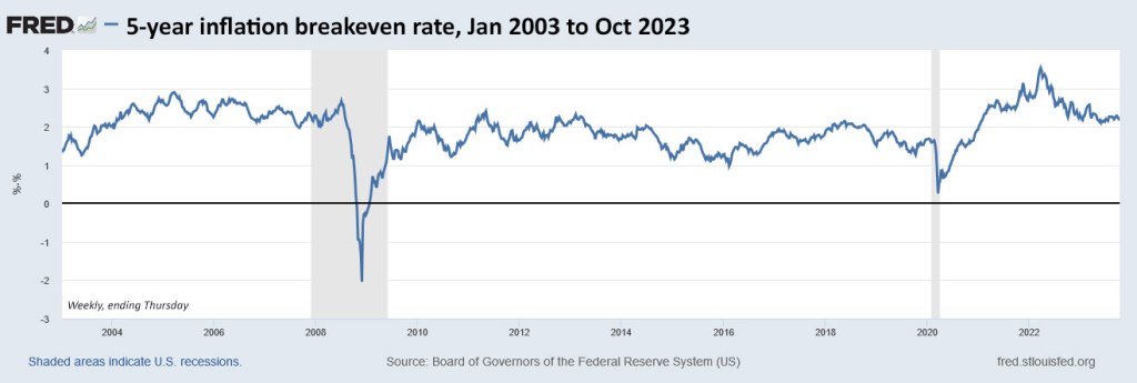 Here is the trend in the 5-year inflation breakeven rate over the last 20 years, showing that the current rate of 2.26% fits into a “normal” range, meaning the TIPS is not expensive versus a nominal Treasury: