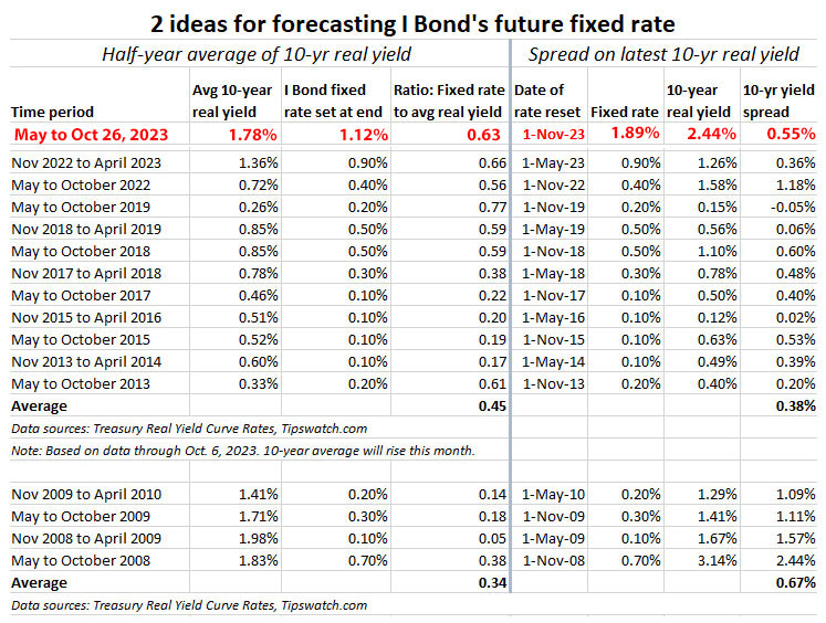 I believe the half-year real yield predictor (which is pointing toward a fixed rate of 1.1% to 1.2%) is a more reliable forecast. However, a fixed rate that low would be a massive 120+ basis points below the real yield of a 10-year TIPS, which would make I Bonds much less desirable in comparison.