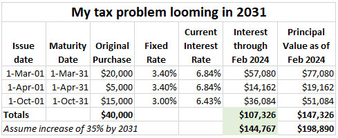Reluctantly, I am going to give up the idea of holding these high-fixed-rate I Bonds until maturity. Now my plan is to redeem one-fifth of the total each year from 2027 to 2031, bringing the interest income to maybe $28,000 a year, an amount we can deal with by adjusting other sources of income (such as IRA withdrawals).