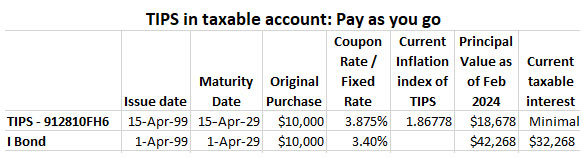 A TIPS held in a taxable account does not create a “tax time bomb.” You pay the taxes as you go. At maturity, taxes are pretty much a non-event.