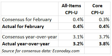 Once again, U.S. inflation ran a bit higher than expected, with all-items seasonally-adjusted prices rising 0.4% for the month and 3.2% year over year. Annual inflation actually ticked higher versus January’s 3.1%.