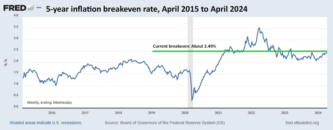 Here is the trend in the 5-year inflation breakeven rate over the last 9 years, showing that the current level is high-ish, but well under the peak we saw in 2022.