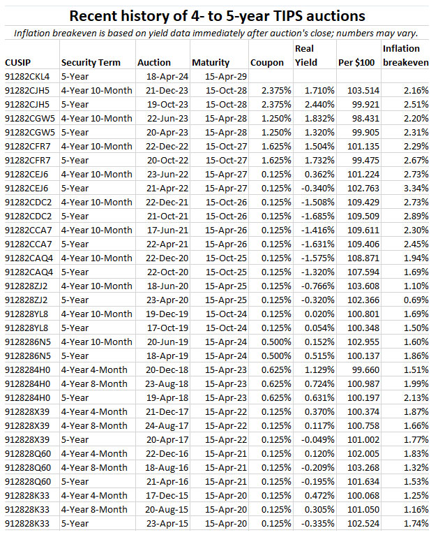 As the market stands one week out, it looks like this TIPS will get an attractive result: Potentially both a real yield and coupon rate higher than 2.0%. The Treasury’s 5-year real yield estimate as of the market close Thursday was 2.13%, which would result in a coupon rate at or above 2.0%.