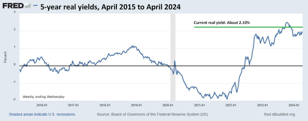 But this market is volatile. Wednesday’s March inflation report reminded everyone that inflationary trends are continuing, and set off a rout in both the stock and bond markets. The 5-year real yield has increased 20 basis points since April 1. That is a huge move higher.