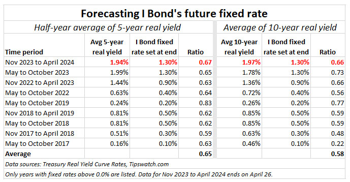 I Bond watchers (like me) had been forecasting that the fixed rate would hold at 1.3%, based on a ratio of 0.65 applied to the six-month average of 5- and 10-year real yields. and then rounded to the tenth decimal point. It was reassuring to see the forecast worked, this time. This gives us a little more supporting data on how the Treasury makes this decision.