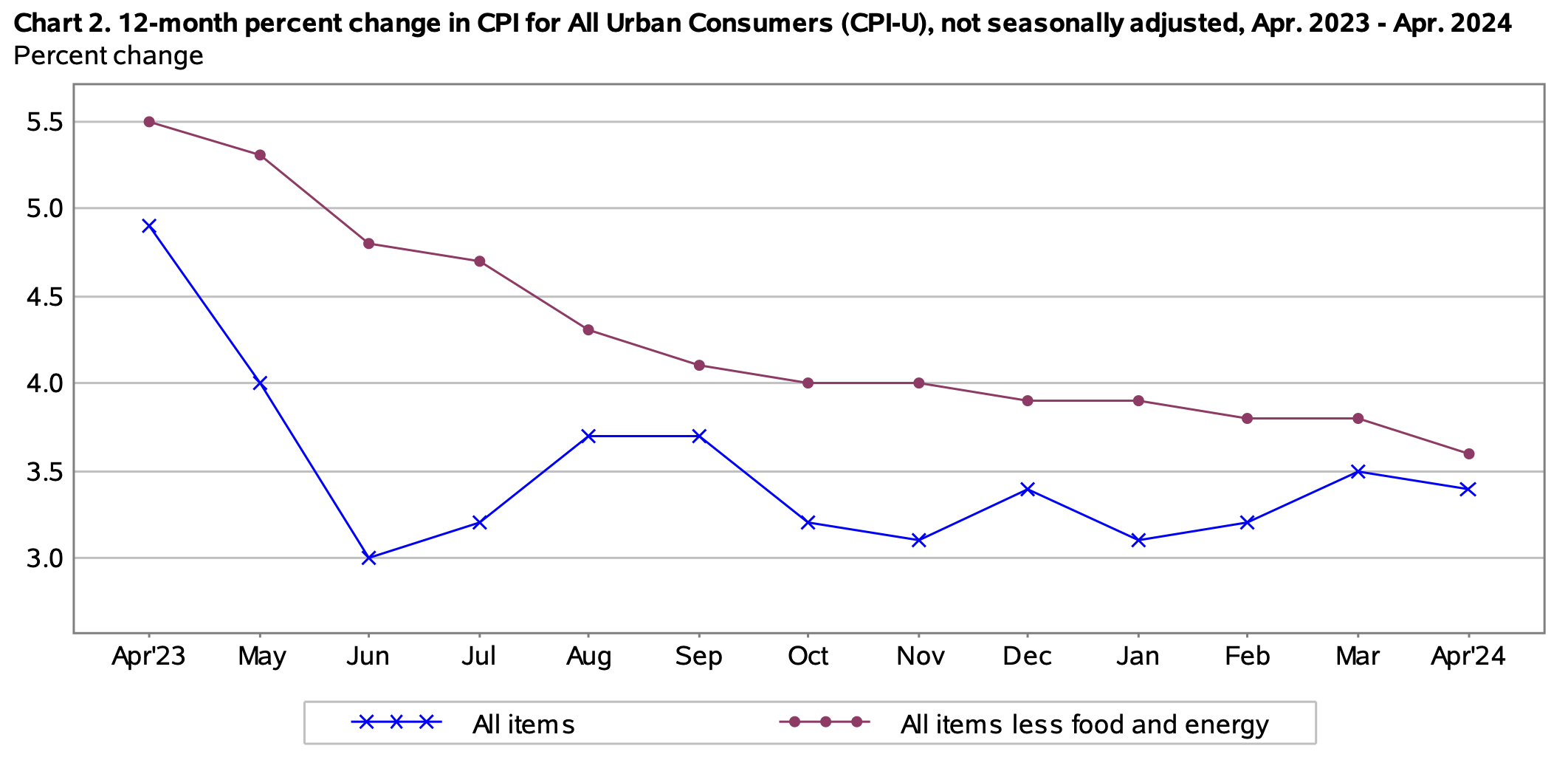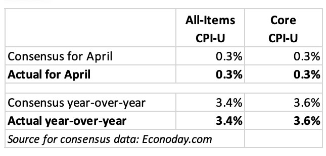 The Consumer Price Index for All Urban Consumers increased 0.3% in April on a seasonally adjusted basis, the U.S. Bureau of Labor Statistics reported today. Over the last 12 months, the all items index increased 3.4%. Those numbers exactly matched expectations.