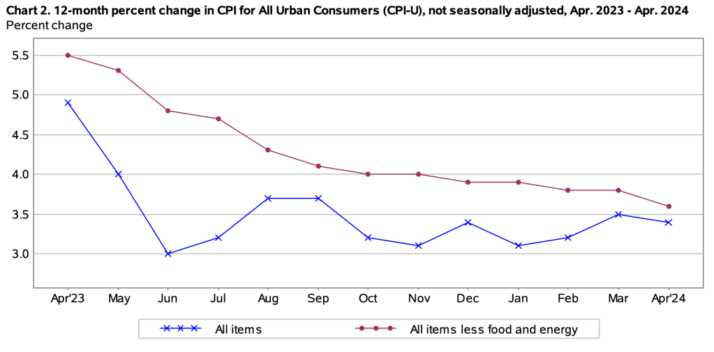 For stock and bond markets, meeting expectations was just fine. By 11 a.m. EDT, the Standard & Poor 500 index was up about 0.85% for the day, and the total bond market was up about 0.57%. A lot of media headlines were putting a positive spin on the BLS report, noting that annual inflation dipped from 3.5% in March to 3.4% in April.