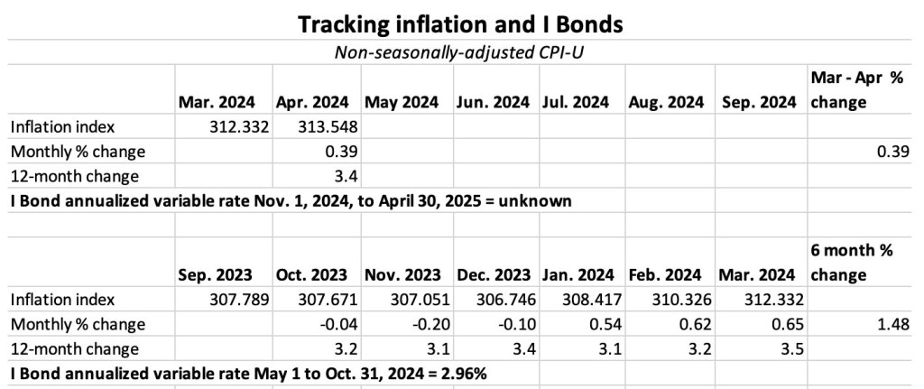 For I Bonds. The April inflation report is the first of a six-month string that will determine the I Bond’s new inflation-adjusted variable rate, which will be reset on November 1 based on inflation from April to September 2024. So far, for one month, inflation has increased 0.39%. We can’t make any assumptions from that single month. Here are the relevant data: