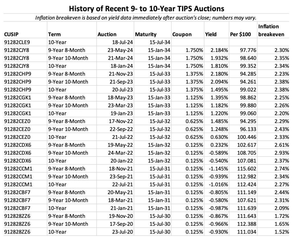 The Treasury estimates the nominal yield of a 10-year Treasury note closed Friday at 4.18%, which creates an inflation breakeven rate of 2.24% for a new 10-year TIPS, based on data from Friday. Things will change before the auction, but a breakeven rate of 2.24% would be the lowest for this term since July 2022.