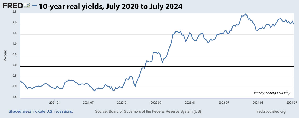 Here is the trend in the 10-year real yield over the last four years, showing that yields remain at attractive levels even after the recent decline: