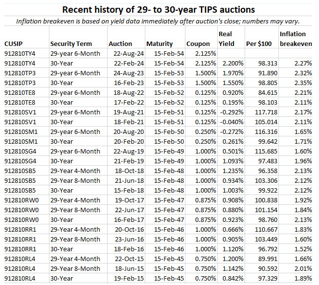 The result will be a 29-year, 6-month TIPS. The coupon rate was set at 2.125% by the originating auction on Feb. 23, 2024, when investors in CUSIP 912810TY4 got a real yield to maturity of 2.20%, the highest in 14 years.