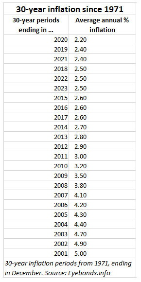 Here is a chart showing 30-year average inflation rates going back to periods beginning in 1971. Not one 30-year period has had an inflation rate below 2.20.%