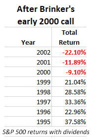 My feeling is that Brinker did sense doom in early 2000 and he made a great call. He reached legendary status after that call, but his later timing advice was randomly good and bad. Investment researchers have found that his overall track record on market timing was so-so. Reminder: No one can predict the market.