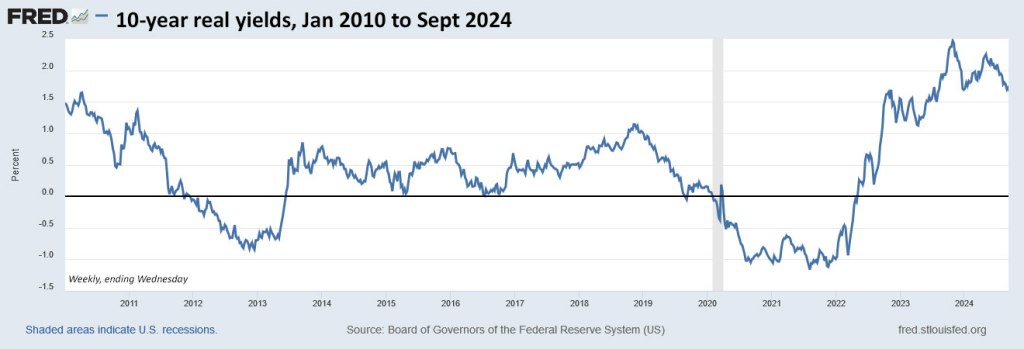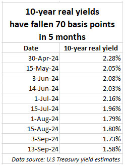 Real yields (meaning yields above inflation) hit a 2024 high on April 30, with the 10-year yield on a Treasury Inflation-Protected Security topping off at 2.28%. This is the trend since then: